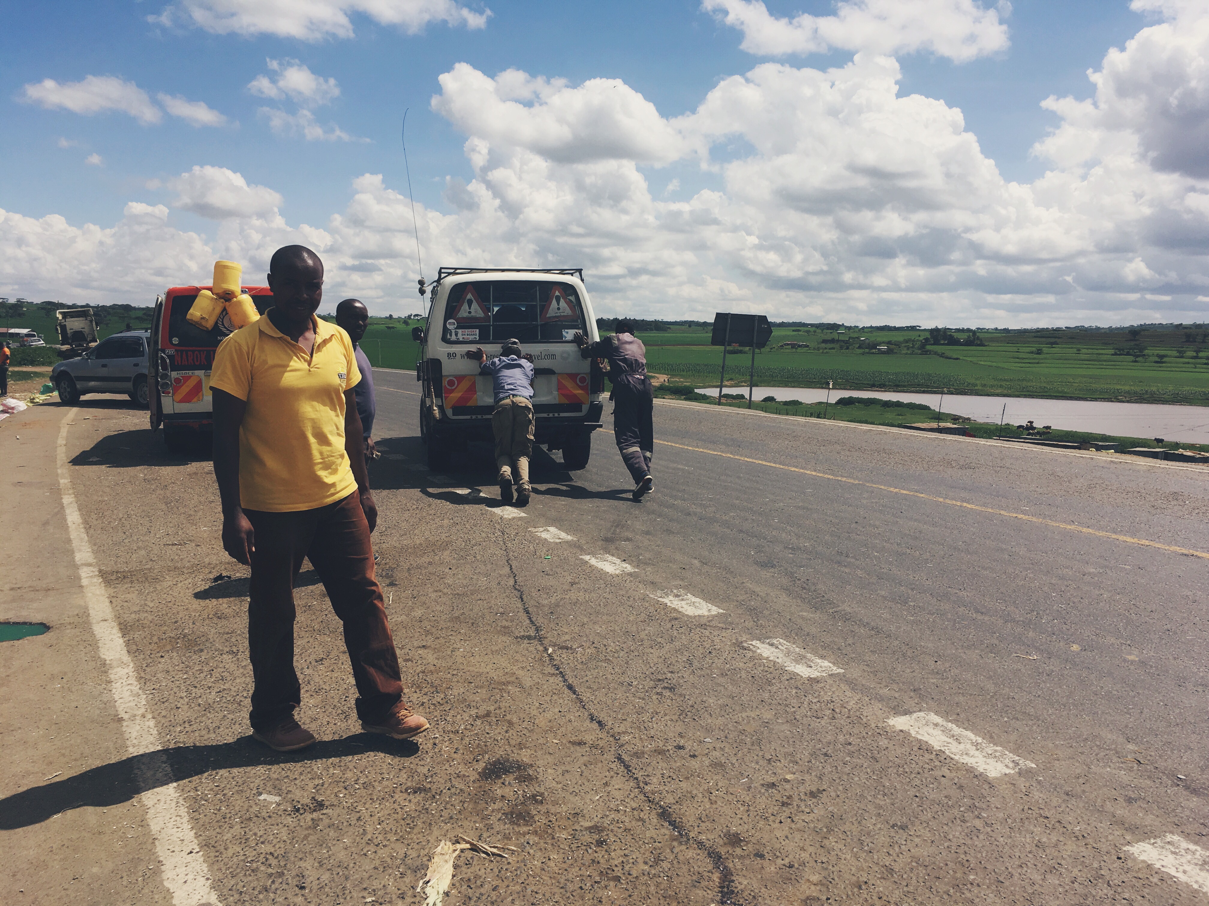 Until our van craps out and rolls to a stop. It’s hot. We get out, and see the rad streaming onto the ground. Our driver seems to think it just needs a drink, but no. The van died relatively close to a small truck stop area, coincidence? So a mechanic and a few other guys come to help. As they unscrew a lid hot liquid sprays them… and the fuel pump is broken. Julious is slightly concerned, but not too fazed. He had tried to get the van to do a rolling start, which didn’t work, so now we’re 100m from the truck stop area. A few scrounging kids menacingly ask us for sweets, then our watches. Julious scares them away. He heads back to find us someone else to drive us while we wait with our belongings and the van, trying to not get robbed in our first 2 hours in Kenya.