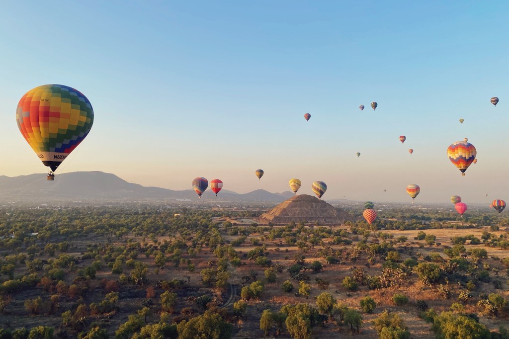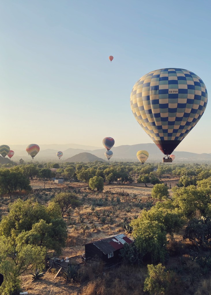 Friday the 25th was sister birthday, per chance you suggest? I assure you not. So, as you do, we went hot air ballooning over Teotihuacán during sunrise. It was bloody cold. Beautiful, but cold. Our driver collected us at the hotel at 5, yes, 5am, and it was a solid 1 hour drive out of the city. Still dark. We all rally at a large field where guests are offered snacks, tea/coffee/concha buns – probably less eating before a potential motion sickness flight is a good idea. We all huddle around the propane patio heaters as dozens of teams assemble and start laying out these massive hot air balloon sheets and the baskets that accompany them. Everyone is offered pictures inside the partially inflated balloons, and its all quite surreal, having never been around such an operation, like circus acid dream.