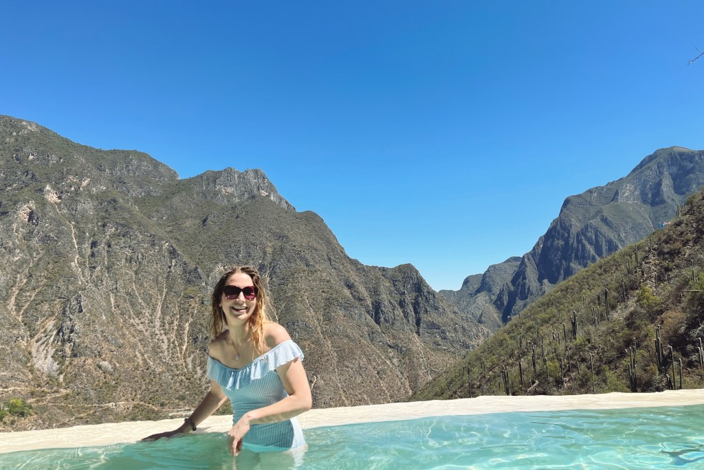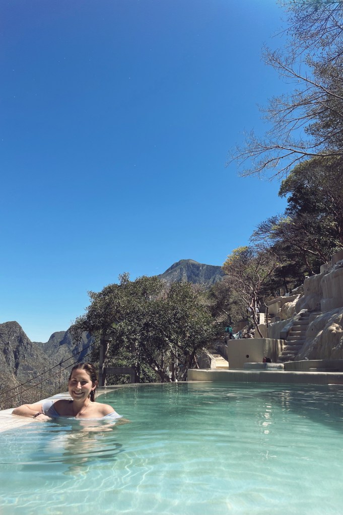 I had stumbled upon Grutas Tolantongo on the gram, as you do. Good old sponsored ads. We booked with airbnb experiences, creatures of habit, as they hadn’t failed us yet, and, spoiler, wouldn’t fail us this time either. We left bright and early, it was a solid 4 hour drive northwest of Mexico City in the state of Hidalgo, plus city traffic delays. Once we were out of the city we stopped for empanadas, sweet and savoury, and hot beverages, at some sort of chain fast food place. The drive took us mainly through desert terrain, over some hills and through valleys, and small towns. We reached our destination close to mid day, after one strange covid esque detour, the bus stopped roadside and we all had to disembark and walk ourselves through some sort of post apocalyptic sanitization chamber, while they sprayed some chemicals in the bus. Of course everyone running the place was in full hazmat.