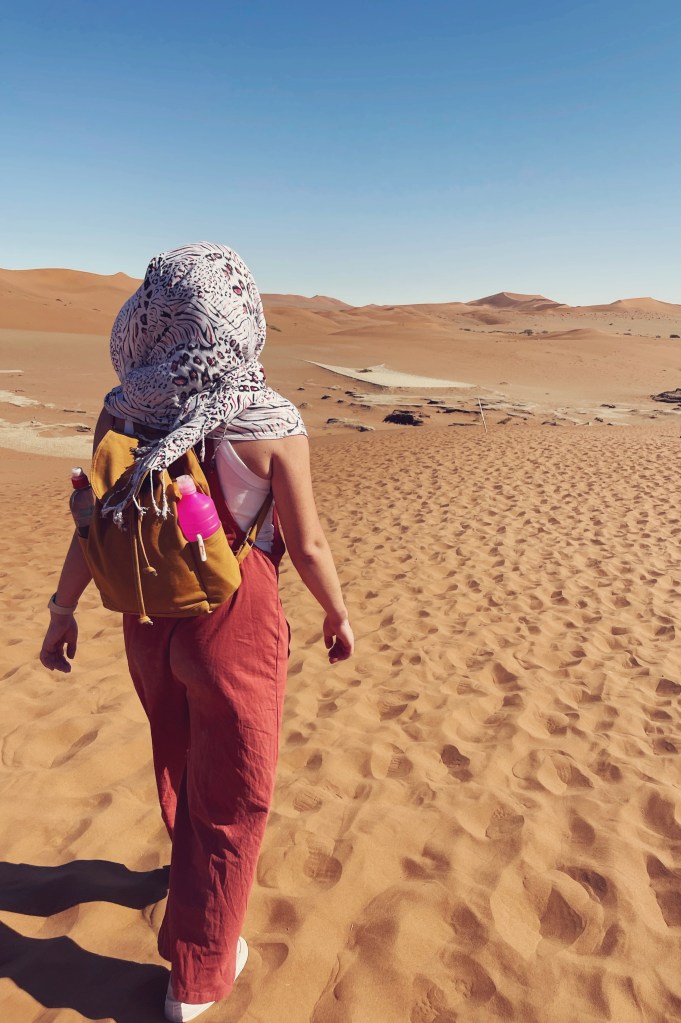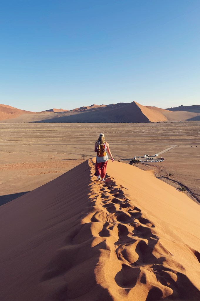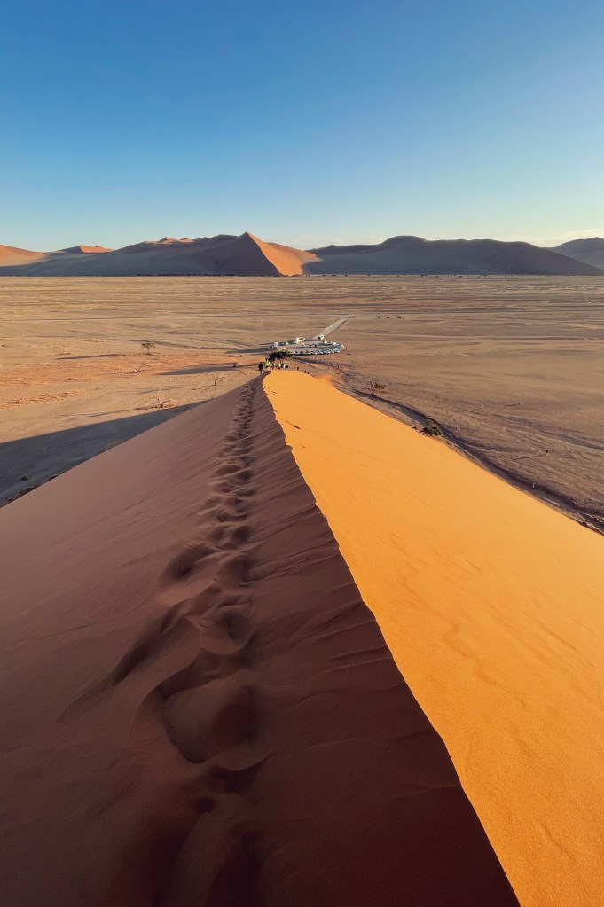 We’re back at camp, and immediately in the pool. We left early to be at the gates of the Namib Naukluft Nation Park before sunrise. Up at 530, breakfast at 6, depart at 630. We were probably sixth in line, with at least two dozen yutes lined up behind. Our first stop was dune 45, sister informs me it is name comes from being 45km from the front gates. It looms over, towering at over 80 meters high and it is composed of 5-million-year-old sands. We didn’t go all the way up, probably over half, but I was pretty winded and the sheer height was making me a little woozy/nervous. It was enough to enjoy the beautiful sunrise over the surrounding dunes, and put the vastness of the area in perspective.