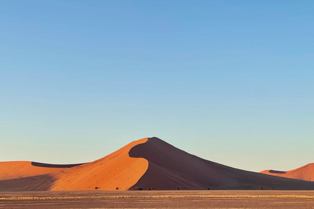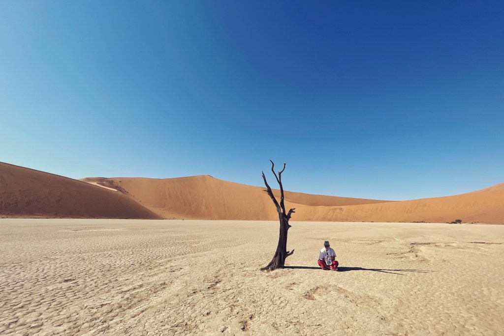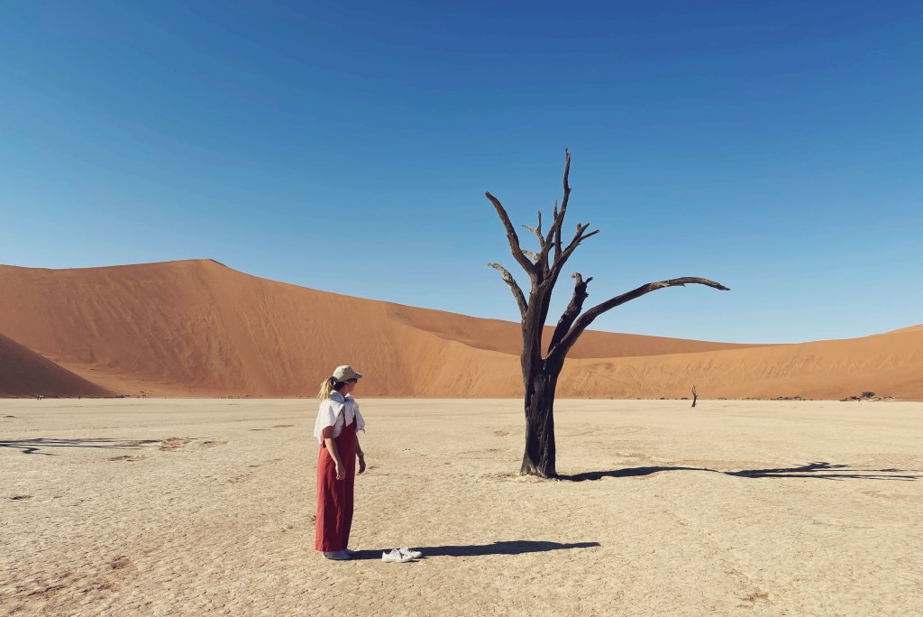 The place was getting packed, like Everest, a solid lineup going both directions. We regrouped and headed deeper into the Namib Desert to gain access to Deadvlei. Deadvlei is a white clay pan, with highly recognizable dead standing trees. The name translates to “dead marsh”, dead, being pretty self explanatory, and the Afrikaans term vlei for marsh. The clay pan formed after yearly rainfall from the nearby Tsauchab River would flood the area creating shallow pools where the abundance of water could sustain hardy flora, namely, the iconic camel thorn trees. Eventually drought hit the area, and sand dunes encroached on the pan, which blocked the river from reaching the area ever again. Slowly, the trees died, as there no longer was enough water to survive the harsh conditions. Although they’re not petrified, the wood does not continue to decompose due to how dry it is. The remaining skeletons of the trees, which are believed to have died more than 600 years ago are black because the intense sun has scorched them. Remaining frozen in time, in a bizarre setting surrounded by the highest sand dunes in the world, “Big Daddy” being the highest, reaching 300–400 meters (350m on average) resting on a sandstone terrace.