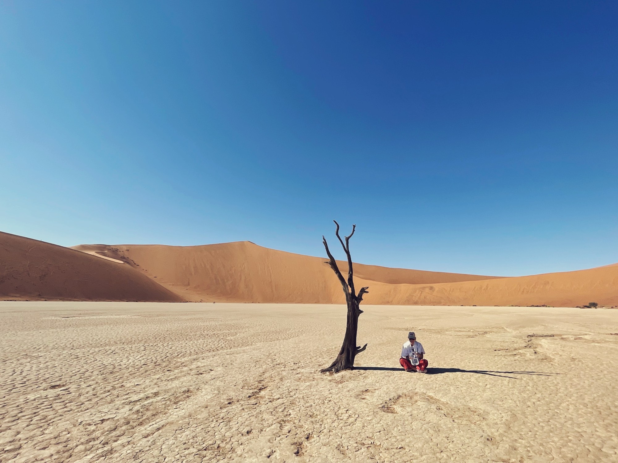 The place was getting packed, like Everest, a solid lineup going both directions. We regrouped and headed deeper into the Namib Desert to gain access to Deadvlei. Deadvlei is a white clay pan, with highly recognizable dead standing trees. The name translates to “dead marsh”, dead, being pretty self explanatory, and the Afrikaans term vlei for marsh. The clay pan formed after yearly rainfall from the nearby Tsauchab River would flood the area creating shallow pools where the abundance of water could sustain hardy flora, namely, the iconic camel thorn trees. Eventually drought hit the area, and sand dunes encroached on the pan, which blocked the river from reaching the area ever again. Slowly, the trees died, as there no longer was enough water to survive the harsh conditions. Although they’re not petrified, the wood does not continue to decompose due to how dry it is. The remaining skeletons of the trees, which are believed to have died more than 600 years ago are black because the intense sun has scorched them. Remaining frozen in time, in a bizarre setting surrounded by the highest sand dunes in the world, “Big Daddy” being the highest, reaching 300–400 meters (350m on average) resting on a sandstone terrace.