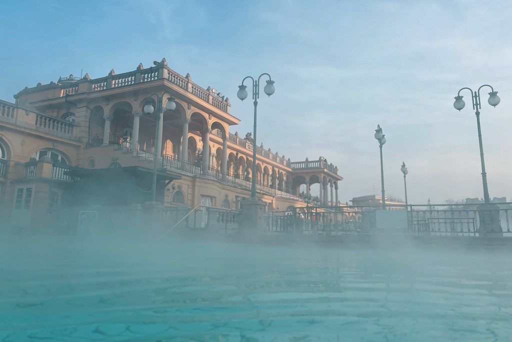 “Szechenyi Baths in Budapest is one of the best and largest spa baths in Europe with its 15 indoor baths and 3 grand outdoor pools, saunas, steam rooms and even a rooftop spa greenhouse.”