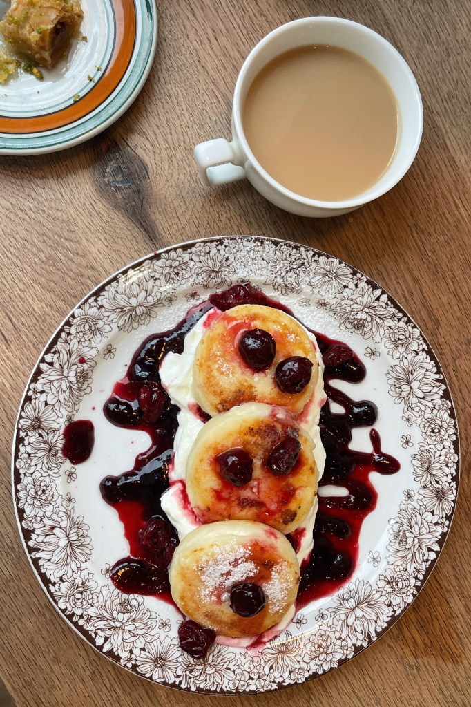 The trip was smooth as butter, and pleasant. Loving the trains. First class was quiet and sparse, table service from the neighbouring dining car and a restful ride. We arrived in Prague in the evening and transferred to our accommodation quickly and efficiently on the metro and set out for dinner, Georgian Kitchen, within a block. It was good, if not slightly underwhelming, the space was modern but loud – not their fault. I was keen to try khachapuri, fresh bread in a unique shape filled with khachapuri cheese curds and baked with an egg and topped with a dab of butter. Delicious, of course. It’s bread and cheese. We also had a nice tomato & cucumber salad and skewered meats, which I thought were going to be different but ended up very much the same.